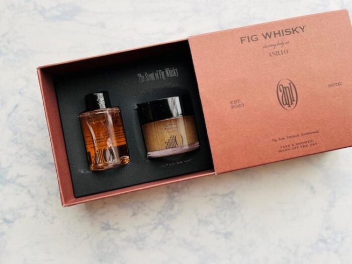 魅惑的な香りの「Fig Whisky」ボディケアアイテムはANILLOらしいコレクションの一つ。濃いウイスキーとイチジクの甘くセンチメンタルな香りで、ミニサイズのスクラブ45gとボディオイル22mlがセットに。ウイスキーカラーのスタイリッシュなボックスに入っていて、ギフトにも喜ばれるアイテムです。