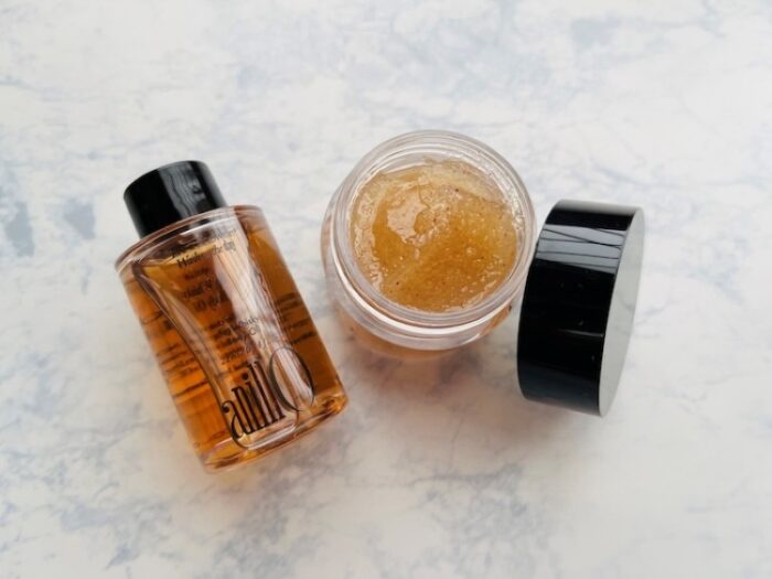 ボディスクラブはクリーンアンデスソルトとココナッツヤシオイルなどの7種のブレンドオイルを配合し、古い角質をやさしくオフしながら、うるおいケアも同時に行える処方です。柔らかいペールカラーのスクラブで、中蓋を開けるとフィグとウイスキーの深い香りがふんわりと漂います。濡れた肌に乗せ、力を入れずに円を描くようにマッサージ。肌あたりがよく、するすると馴染むようにスクラブの粒が溶けていきます。洗い流すとつるんとしたなめらかな肌に、またオイルによるしっとり感も得られます。
