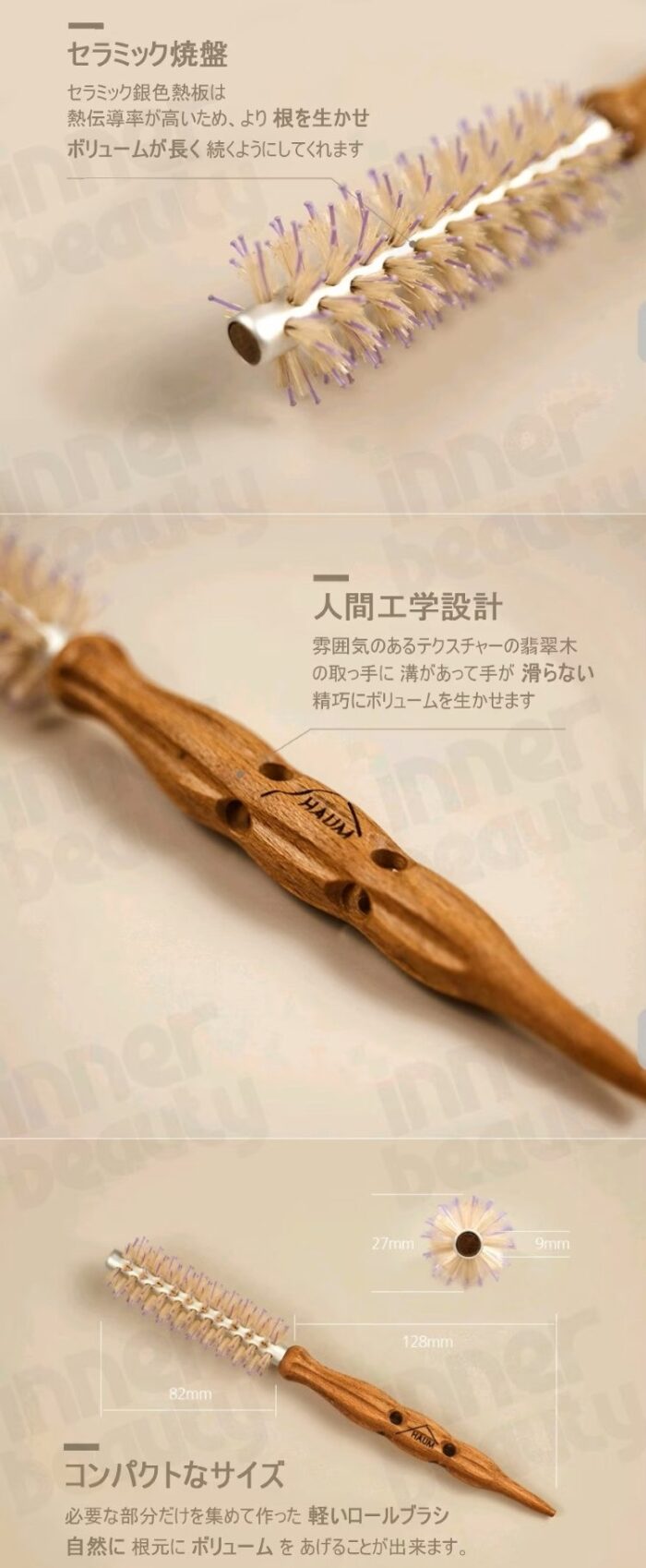 サロン帰りのようなヘアを目指せると話題のロールブラシは、パステルカラーのブラシに木製の柄がついたキュートでスタイリッシュなデザイン。柔らかい毛質にこだわった豚毛を使用し、髪に絡みやすく、テクニックいらずでふんわりヘアに。髪の長さやなりたいスタイルによって選べる、27mm、34mm、58mmの3サイズ展開となっています。ブラシのカラーはそれぞれピンク、ベージュ、ラベンダー、オレンジの4色が揃います。