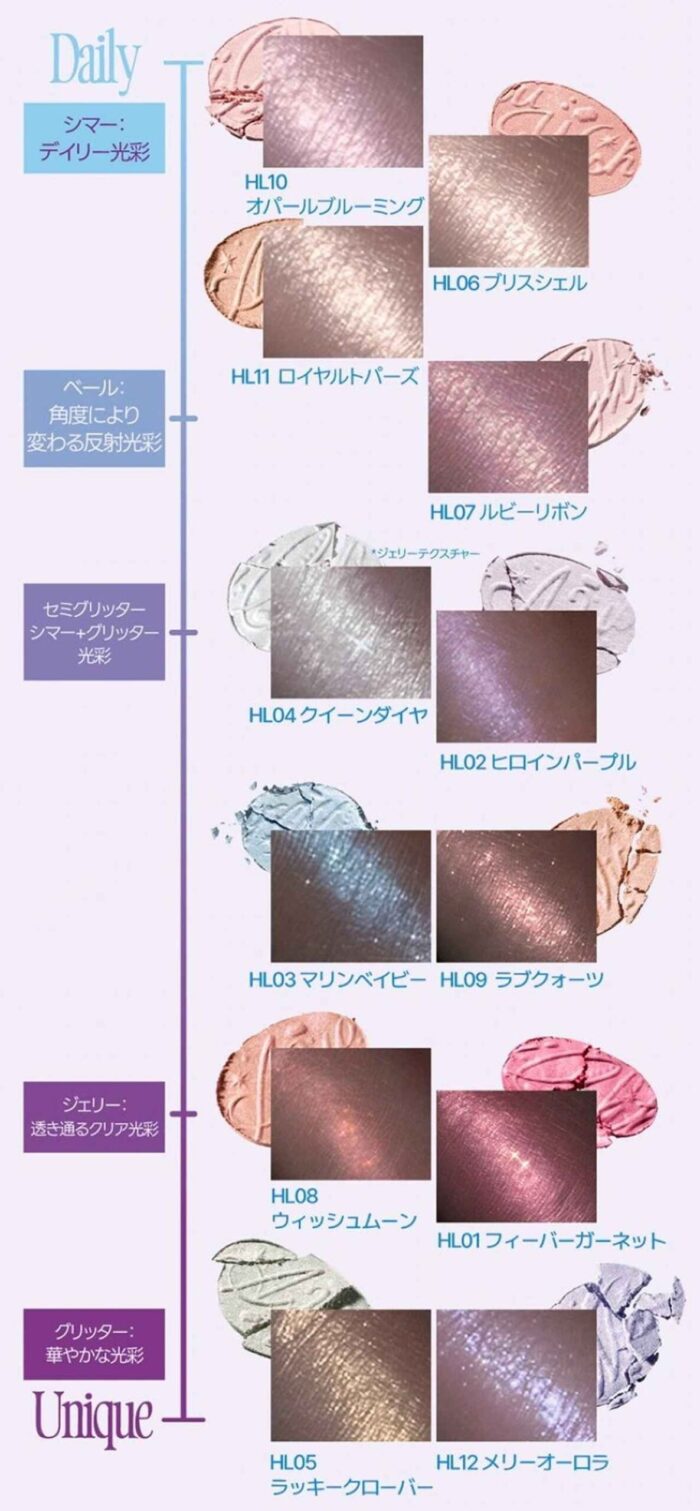 韓国でも人気のコスメブランド『fwee(フィー)』のグリッター入りハイライターは圧巻の全12色! カラーによってシマー、ベール、セミグリッター、ジェリー、グリッターと5つの異なる輝きが楽しめます。ハイライトとして頰や目周りに使うのはもちろん、ベースカラーが発色するのでアイシャドウやチークとして使ってもOK。肌にぴったり密着して、ヨレずに仕上がりの美しさが長持ちします。