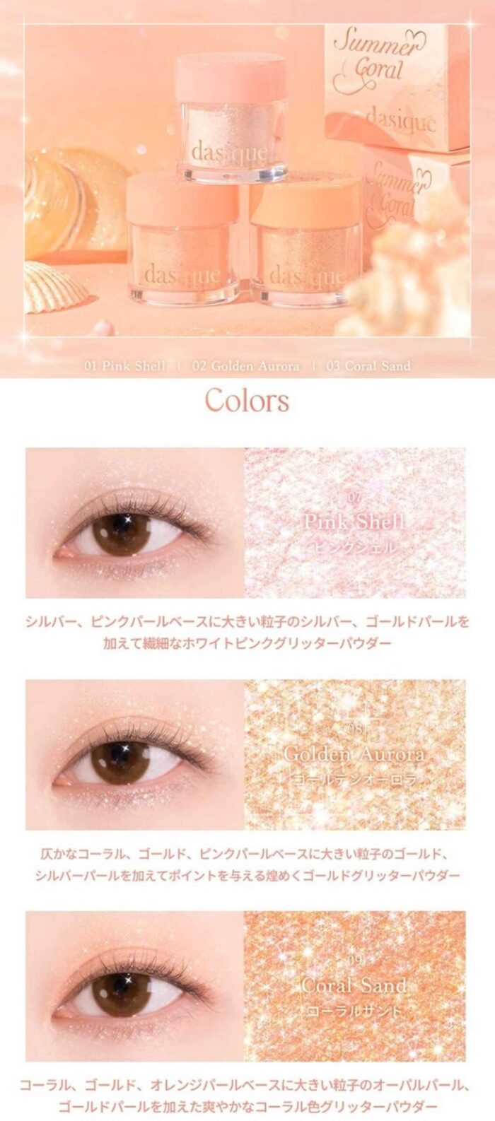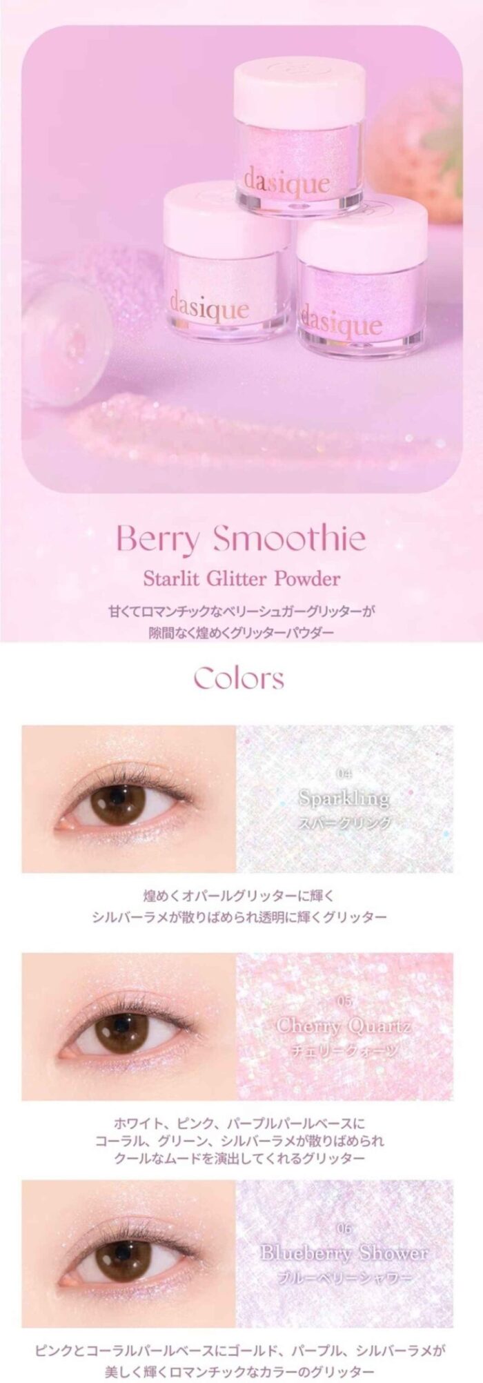 透明感のある色彩と繊細なラメ使いが可愛いと話題の『dasique(デイジーク)』。ルースタイプのグリッターパウダーは、100%パール原料だけを使用しているので清涼感のある輝きがキレイです。目元やチークにプラスすればデイリーメイクがバージョンアップ♡ ボディパウダーに混ぜてデコルテなどに使ってもステキです。 カラーは「ベリースムージー」と「サマーコーラル」で、それぞれ3色セットなのも嬉しい♪