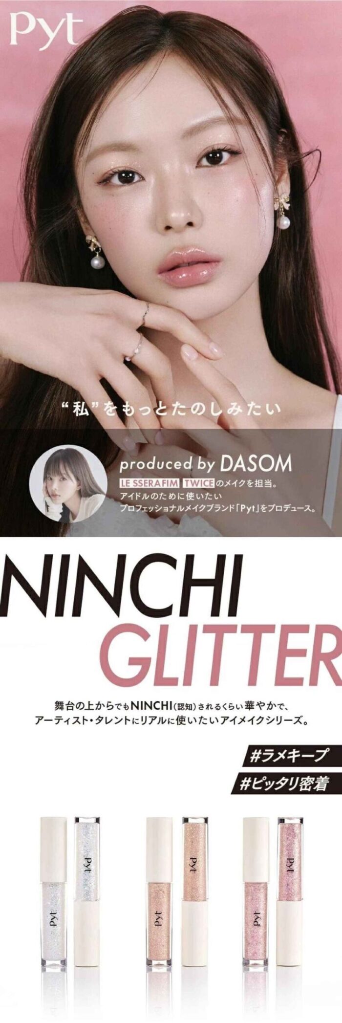 『Pyt(ピュット)』は、K-POPなど韓国ビューティーシーンの最前線で活躍するメイクアップアーティストDASOM氏の技術と経験が詰まった、プロのメイクテクニックとセルフメイクのしやすさを両立したブランドです。“舞台の上からでもニンチ(認知)されるくらい華やかに”と設計された3種のグリッターは、大粒ラメ入りでもリアルな使いやすさも◎。ウォータージェル処方で、メイクしたてのような輝きが長時間持続します。