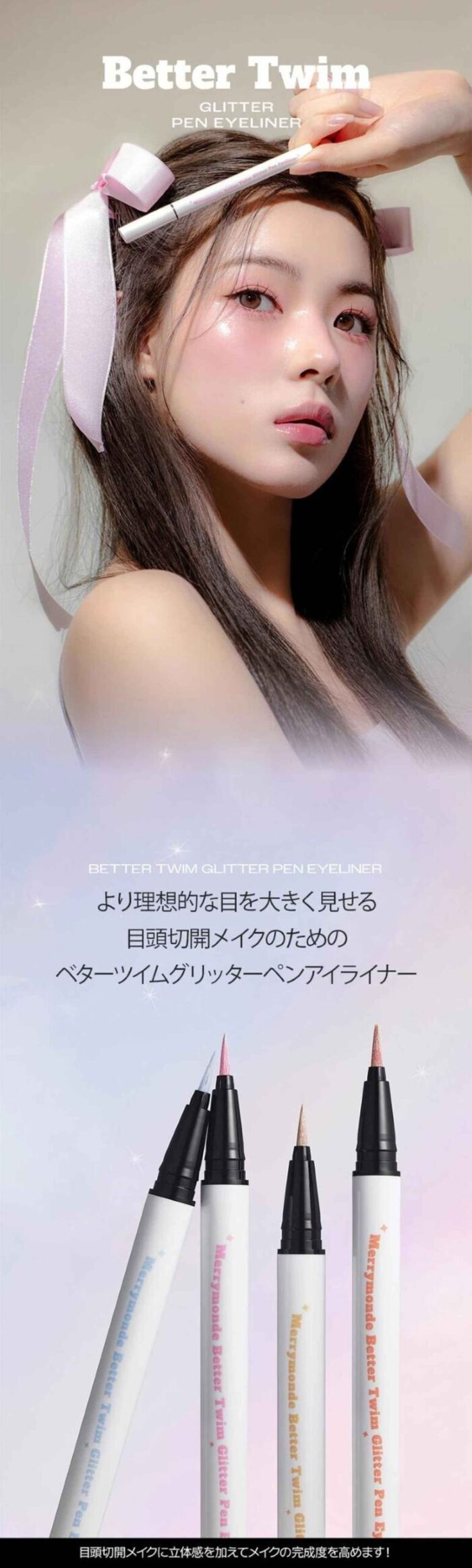 キュートなメイクアイテムがそろう韓国のコスメブランド『Merry monde(メリーモンド)』。まつ毛のキワに繊細に光るラインが描けるグリッター入りアイライナーは、日常使いもできて便利です。ほかにも涙袋メイクや、切開メイクにプラスして立体感を出したりなど、使い方はいろいろ! カラーはピンク、ブルー、ベージュ、ローズの4色があります。