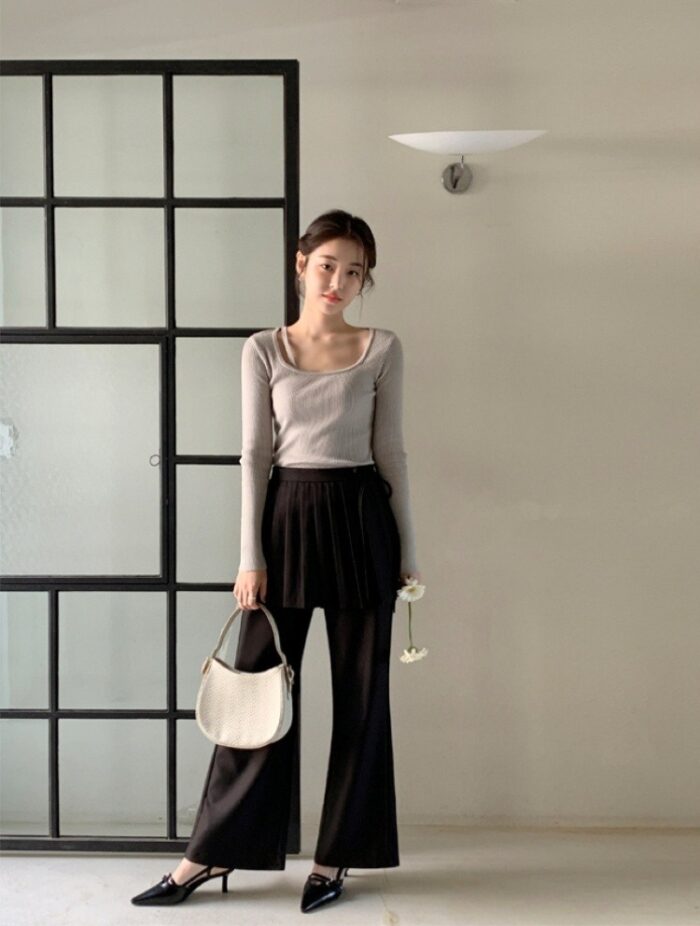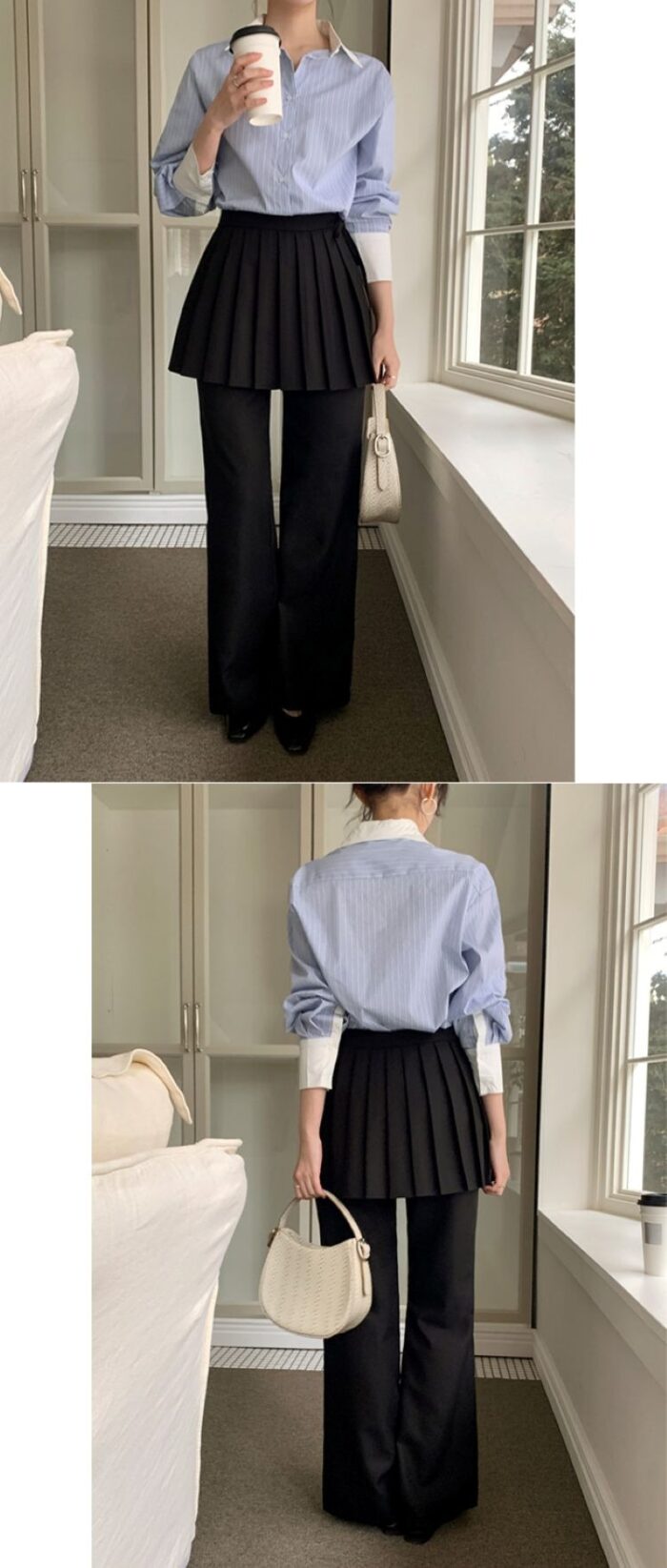 ブラックのワイドパンツ&プリーツスカートのセットは、オフィススタイルにも着回せてすごく便利! シャツを合わせればキチンと感が演出でき、ニットをコーデすれば一気にフェミニンな雰囲気に。別々に使えるので、手持ちの服に合わせて季節問わず活躍してくれそうです。