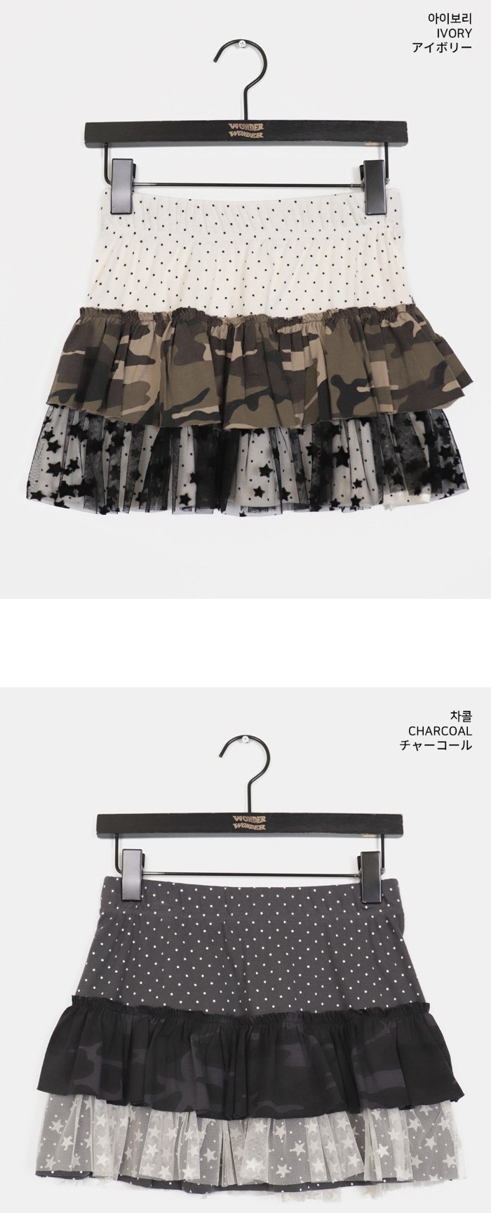 デニムやワイドパンツの上にはくだけでコーデが可愛くなっちゃうカンカンミニスカート。3段のティアードは、ドット・カモフラージュ・星の3つの柄合わせになっていて今年のトレンド感もバッチリです。タウンユースにも、ライブやカジュアルなパーティに出かける時にも大活躍♡