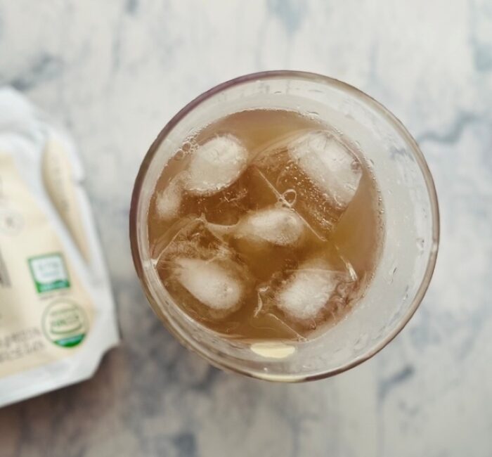 パウチにはイージーカットが付いており、手で簡単に開けることができます。そして、さりげなく右側に施された空気入りクッションのような部分が有難く、こちらに手を添えると楽に注げます。冷蔵庫で冷やし、さらに氷を入れていただきました。