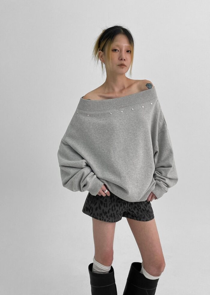 落ち着いたトーンのレオパード柄のショートパンツをビッグサイズのオフショルダースウェットとコーデ。ぴったりしすぎないショート丈なので、クールな大人カジュアルに着こなせます。ネックラインのスタッズやシルバーのアクセでロックテイストを添えてカッコよくまとめて! 足もとはロングブーツを合わせて秋冬モードに。