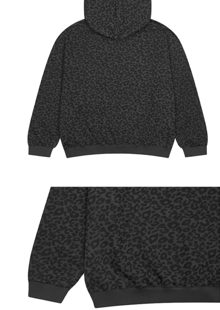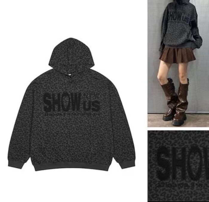 ゆったりしたオーバーフィットな薄手のフーディーは、チャコールグレーのレオパード柄がクールなムードを漂わせます。胸元にはSHOW USのグラフィックワッペンが刺繍され、ハイカジュアルなストリートテイストに。ボトムスにはブラウンのミニプリーツにボリューミーなクシュクシュブーツを合わせてトレンドライクにまとめています。