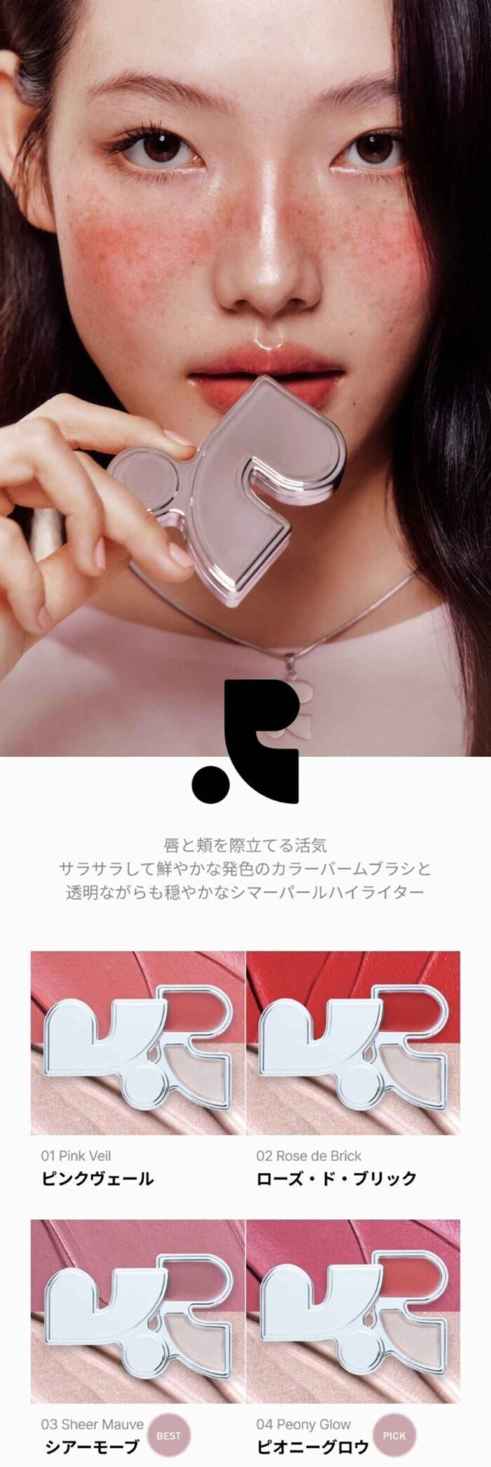 ブランドローンチのスタートとして発売された「マルチブラッシュ&ハイライターデュオ」。シルキーなクリームテクスチャーのカラーバームとほのかなシマーパール入りのハイライターがセットされていて、リップメイクにも使えます。ブラッシュは軽いタッチで鮮やかな発色が楽しめ、ハイライターは透明感のあるツヤを肌にプラスできる設計。カラーはピンク系やモーブ系の4種が揃います。ロゴマークの「R」をデザインしたパッケージもオシャレで、専用のキーリングをバッグやポーチにつけても可愛い♡