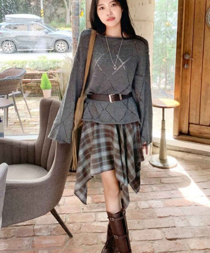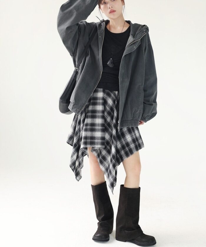 チェック柄のアンバランススカートも今シーズンのトレンドアイテム。ブラック系のチェックにはブラックのニットとブーツでモノトーンにまとめています。ウォッシュデニムのブルゾンを羽織って、キレイめなグランジテイストをプラス。スカートの下にデニムやスウェットパンツを穿いてスポーティにスタイリングしても◎。