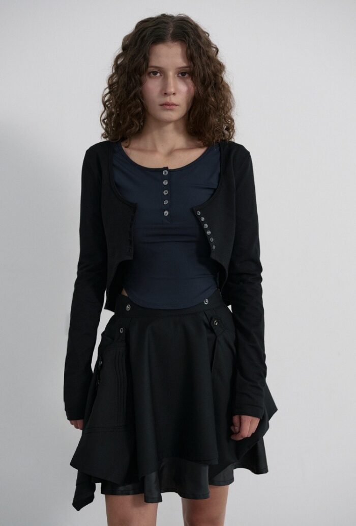 タイトなトップスにアンバランススカートを合わせたフレンチシックなブラックコーデ。トップスやボレロのスナップボタンとスカートのスタッズがコーデのアクセントになっています。両サイドに長めの生地をあしらったレイヤードシルエットで、右下のミニポケットが、ユーティリティなエッセンスをプラス。足もとは黒のミディアムブーツで今旬な肌見せバランスに。