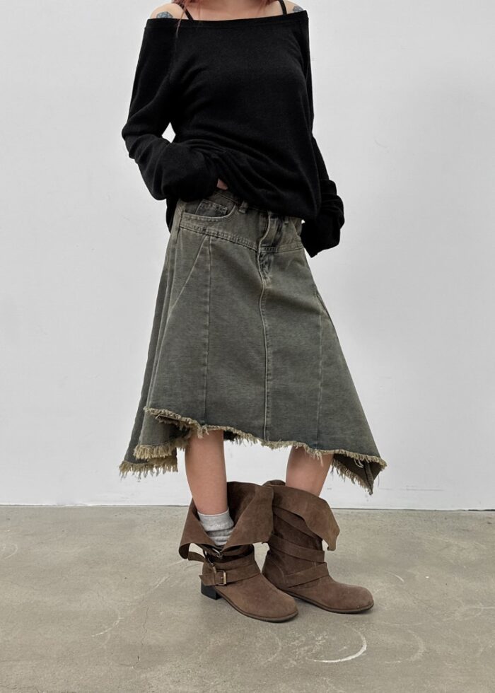 アシンメトリーなデニムスカートをスタイリッシュに