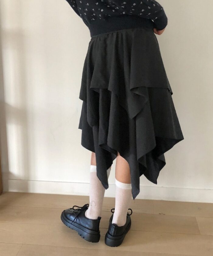 ダブルのティアードデザインで膝が見え隠れするミディ丈のアンバランススカート。ノスタルジックな小花柄のカーディガンを合わせて、ダークカラーでコーデ。スカートはローウエストで履いてほんのり脱力感を醸し出しています。足もとは黒のレースアップシューズに白のシアーリブソックスを履いて、モノトーンの中にも儚さが漂うスタイルに。