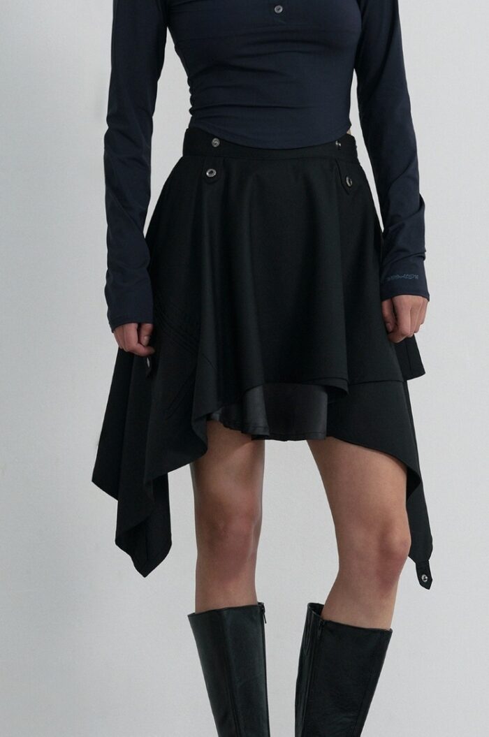 タイトなトップスにアンバランススカートを合わせたフレンチシックなブラックコーデ。トップスやボレロのスナップボタンとスカートのスタッズがコーデのアクセントになっています。両サイドに長めの生地をあしらったレイヤードシルエットで、右下のミニポケットが、ユーティリティなエッセンスをプラス。足もとは黒のミディアムブーツで今旬な肌見せバランスに。