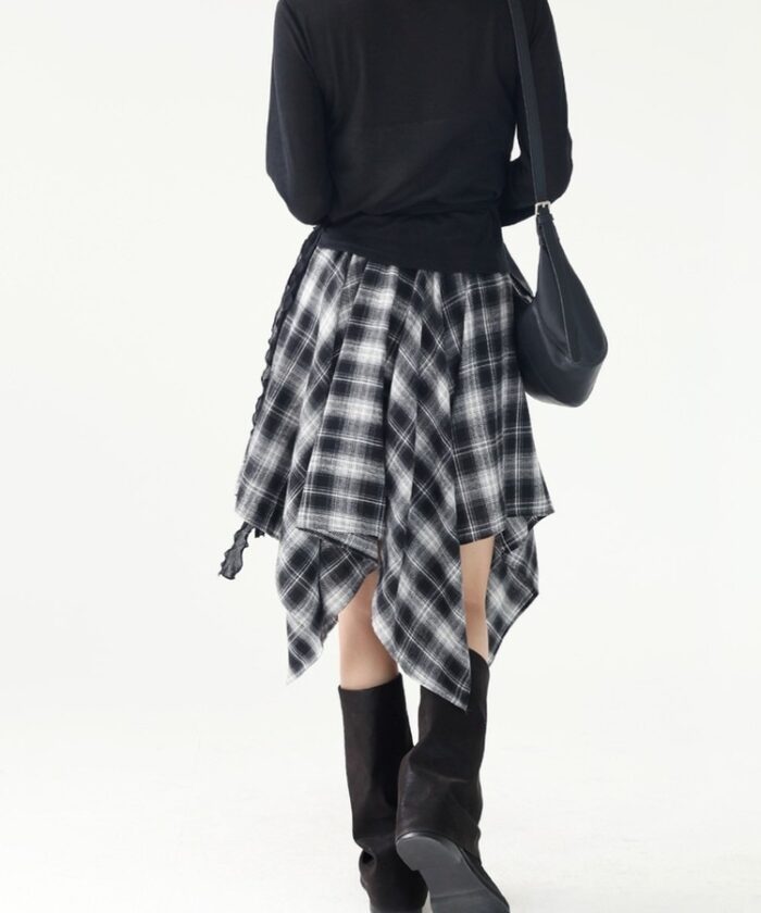 チェック柄のアンバランススカートも今シーズンのトレンドアイテム。ブラック系のチェックにはブラックのニットとブーツでモノトーンにまとめています。ウォッシュデニムのブルゾンを羽織って、キレイめなグランジテイストをプラス。スカートの下にデニムやスウェットパンツを穿いてスポーティにスタイリングしても◎。