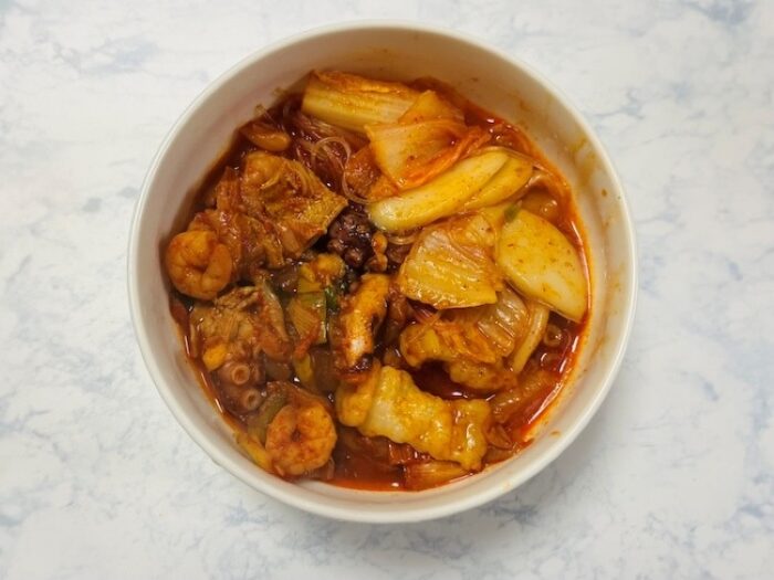 大鍋がいっぱいになるほどの海鮮や牛モツ、野菜類がどっさりと入っています。調理中から豊潤で甘辛な香りが漂ってきて美味しそう! 旨みはそのままに辛さをマイルドにするなら、トックやチーズをトッピングしてもよく、今回はトック、春雨、白菜を入れてみました。
