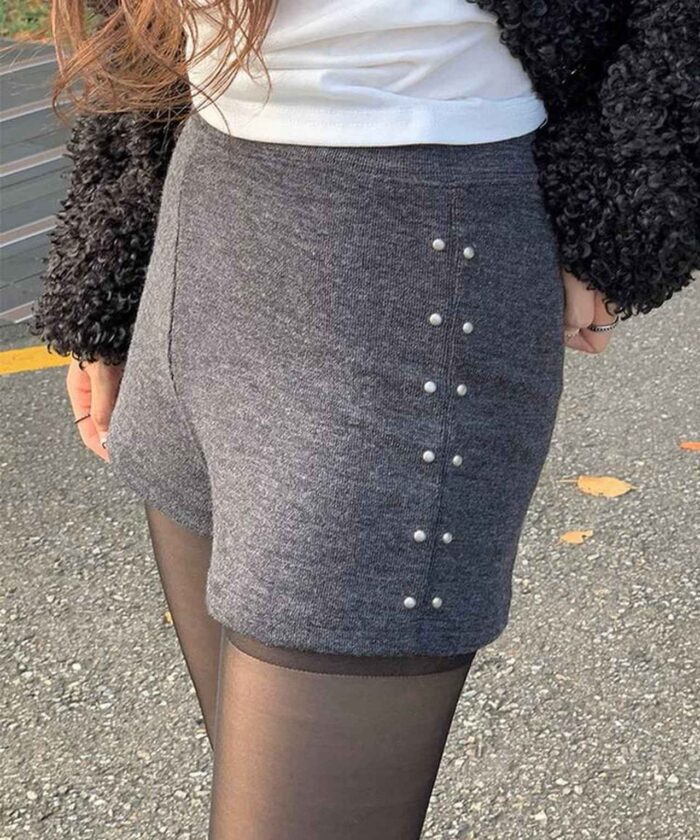 ダークグレーのニットパンツはベーシックなジャストフィットタイプ。ハイゲージニットでキレイに穿くことができ、立体感をもたらす杢調グレーとサイドに施されたミニパールがアクセント。ふわもこなボアジャケットにニットのショートパンツスタイルで重軽のバランスもばっちり。足もとはシアータイツにスエードのレースアップブーツを合わせて質感たっぷりな冬コーデに。