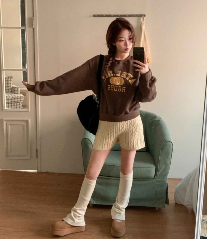 裾フリルがついたリブニットのショートパンツは、甘めトーンのバレエコアコーデに仕上げて。シアートップスとセットアップのニットをレイヤードして、優しげなミルキーカラーのオールホワイトが冬に映えます。同じくリブのレッグウォーマーに厚底のムートンブーツでボリューム感のある足もとに。