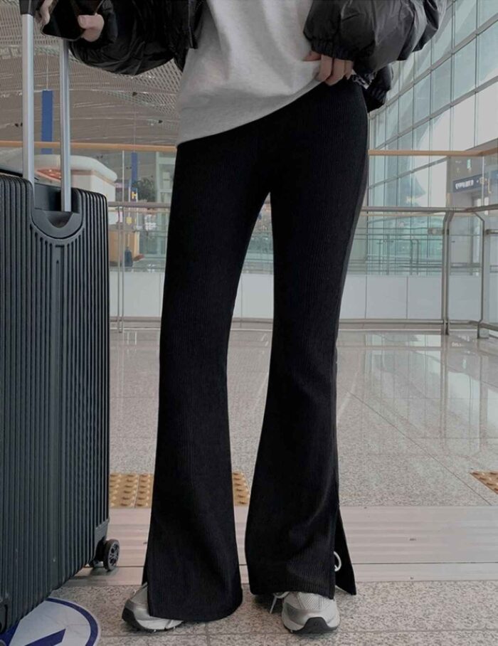 デイリーユースにぴったりなリブ素材のブーツカットパンツ。サイドスリット入りで、抜け感のあるデザインに仕上がっています。フィット感のある黒のパンツにオーバーサイズのライトグレーのスウェットで全体のバランスも◎ ニット帽とハイテクスニーカーでアクティブなカジュアルコーデに。裏起毛で暖かく、旅行などの長時間の着用にもおすすめです。
