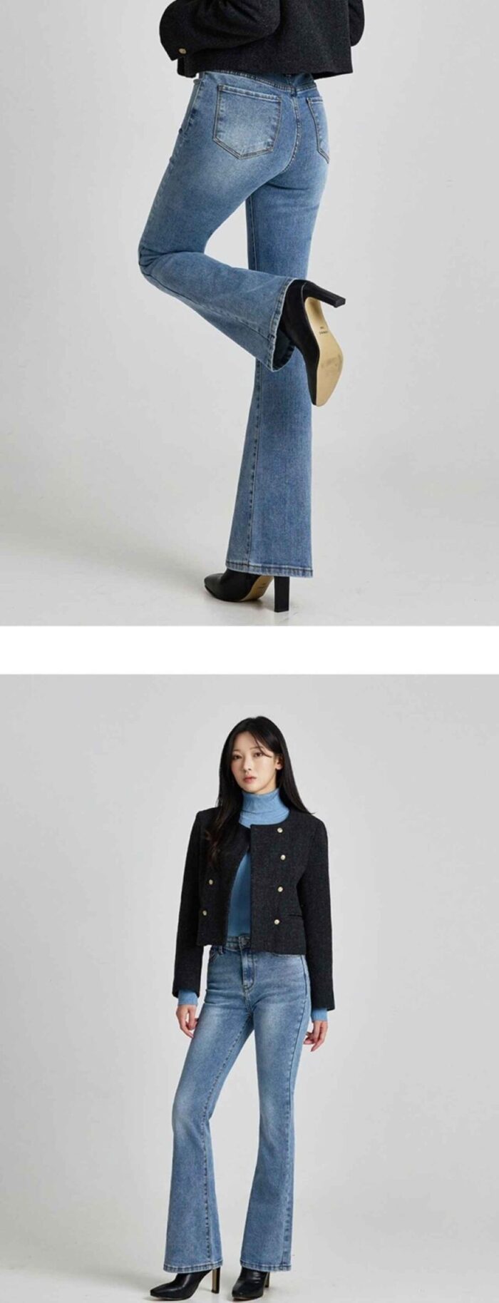 ウエストゴム×ストレッチ性の高い生地で、スリムなシルエットでも穿き心地の良さを追求したフレアデニム。キレイめに着こなせるほどよいウォッシング加工で立体感を高めています。トップスにはフィットしたタートルネックニットとコンパクトなノーカラージャケットを合わせて品よくコーデ。ベーシックなスタイルにフレアデニムがトレンド感をプラスしています。