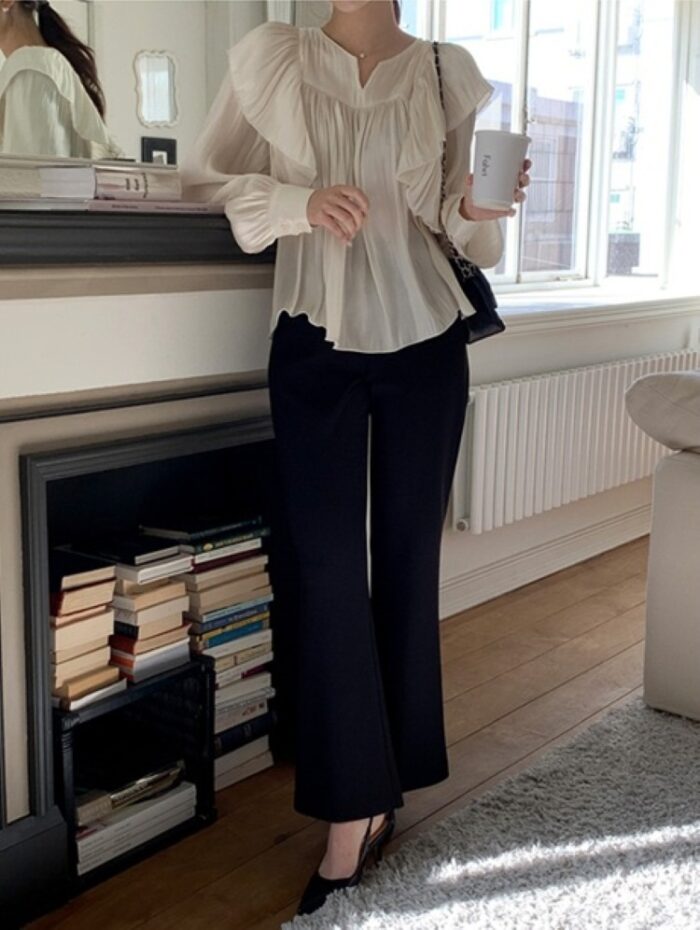 フレアスラックスでレディライクな着こなしを
